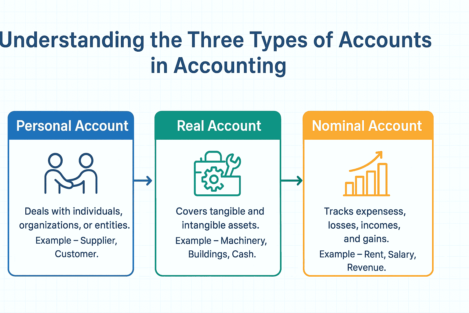 Real accounts deal with tangible and intangible assets (e.g., cash, machinery, buildings, patents). When an asset comes into the business, it is debited, and when an asset goes out, it is credited. This includes all accounts related persons consist of natural, artificial and representative accounts.