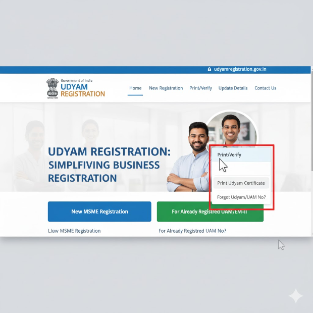 On the homepage, look for the "Print/Verify" option in the top menu bar. Click on it. From the dropdown menu, select "Print Udyam Certificate".