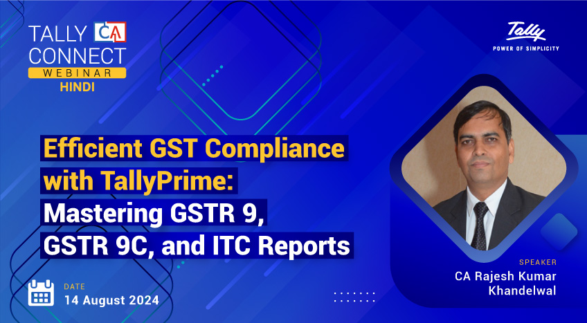 Date Aug 14 2024 Expired! Time 3:00 pm - 4:30 pm Easy Compliance with TallyPrime for GST & Income Tax Speaker – CA Rajesh Kumar Khandelwal Description Preparation of GSTR 9 Preparation of GSTR 9C Expense-wise summary of the ITC Report Share this event + Add to Google Calendar + iCal / Outlook export