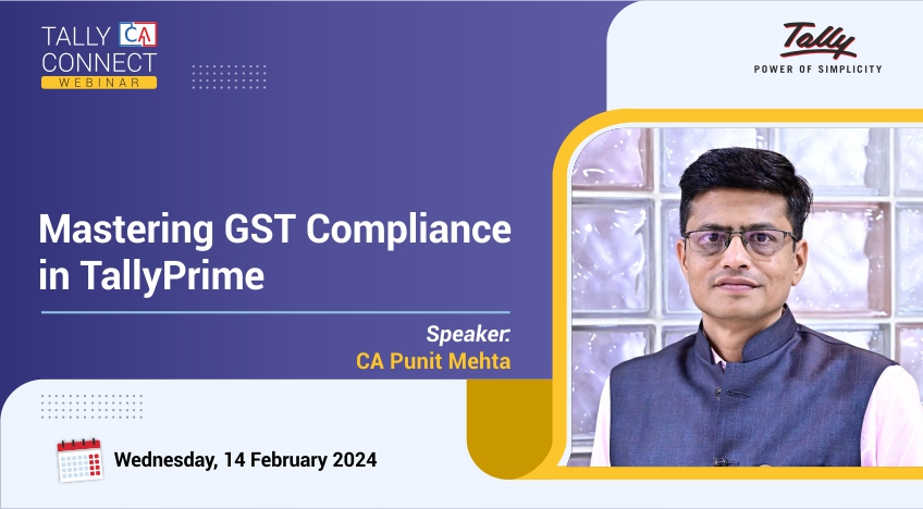 Date Feb 14 2024 Expired! Time 3:00 pm - 4:30 pm Mastering GST Compliance in TallyPrime Speaker : CA Punit Mehta Description – Ways to adapt GST in latest TallyPrime – Common queries that users confront for GST configurations and how to handle them effectively – 3 GST features to help CAs work smarter and better in Release 4.0 Share this event + Add to Google Calendar + iCal / Outlook export