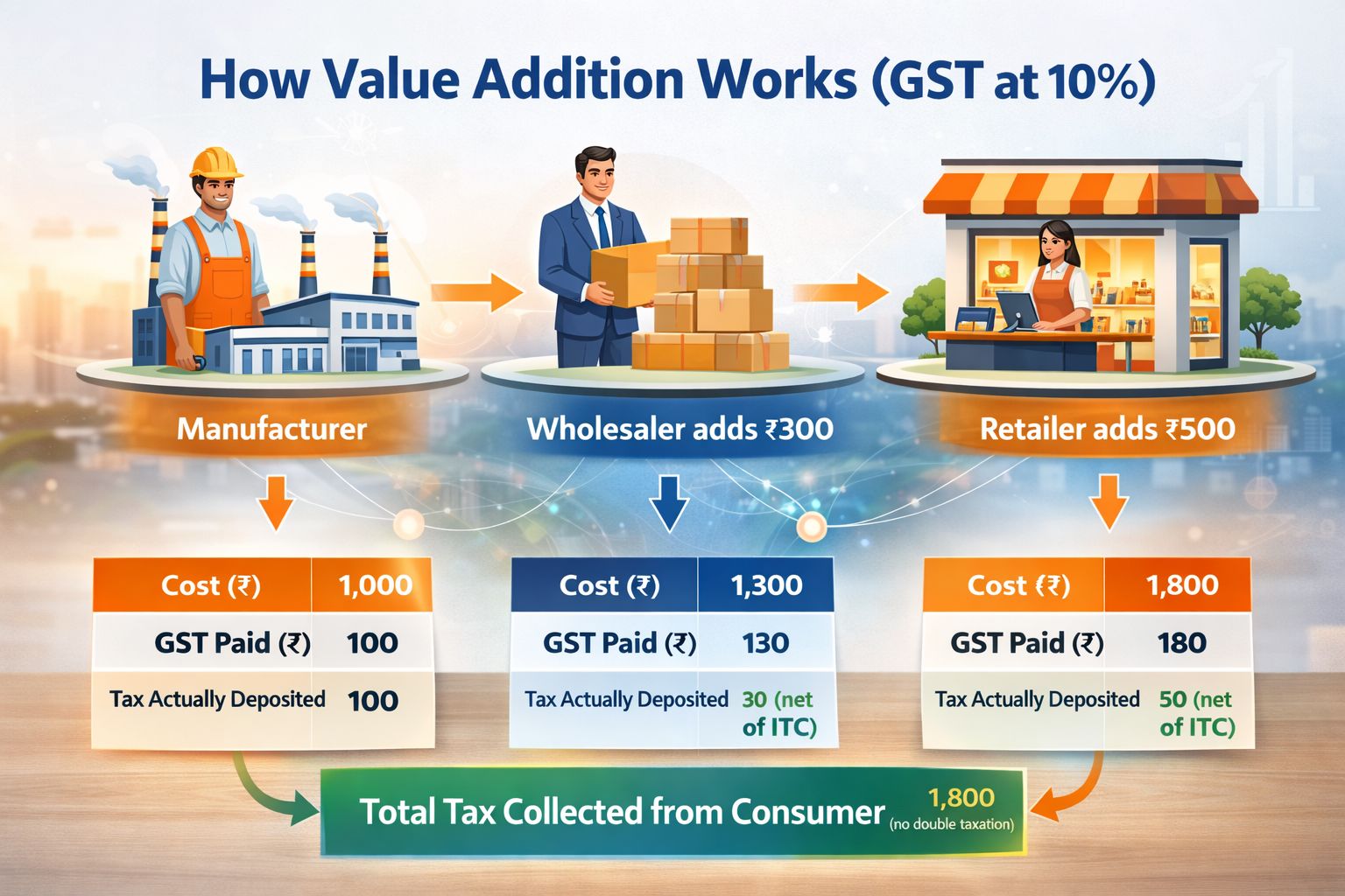 GST is levied only on the value added at each stage of production or distribution — not on the total value of the product. This is what eliminates the cascading effect and keeps prices lower for the end consumer.