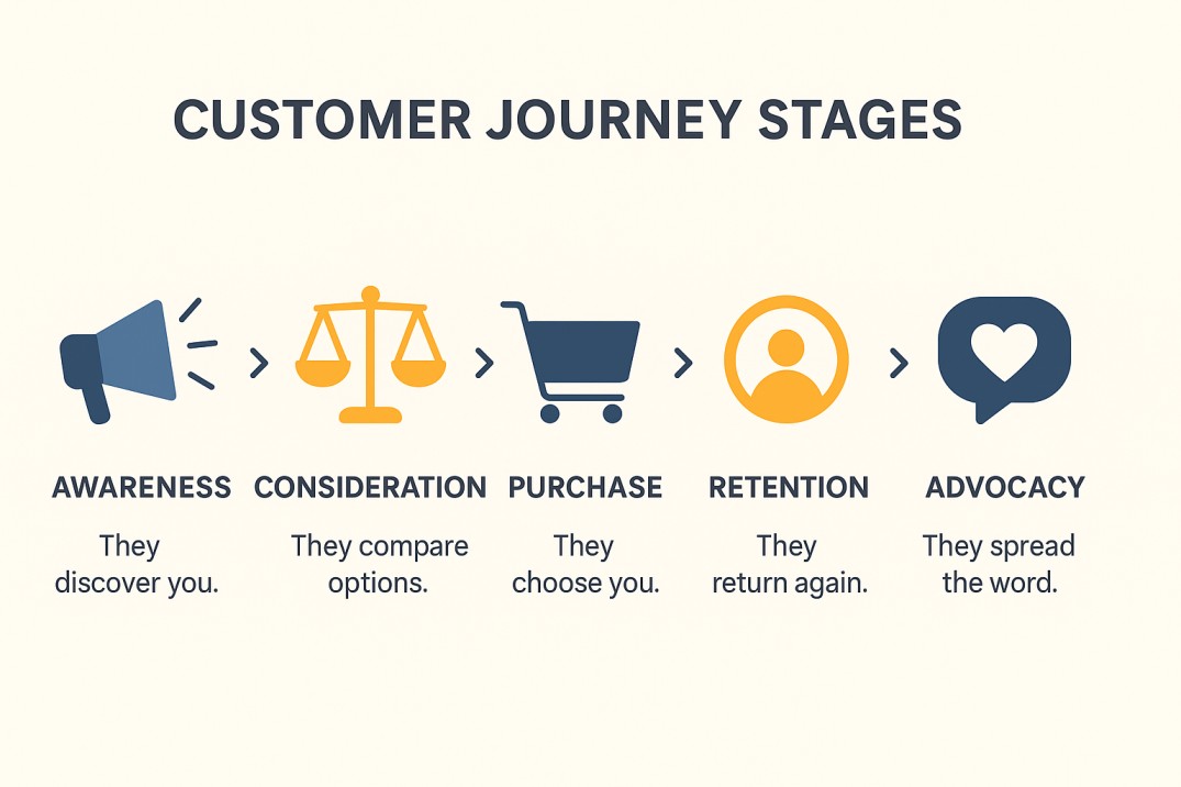 These are the key steps your customer goes through when interacting with your business. Understanding each stage helps you see where customers might lose interest and where you can guide them forward.