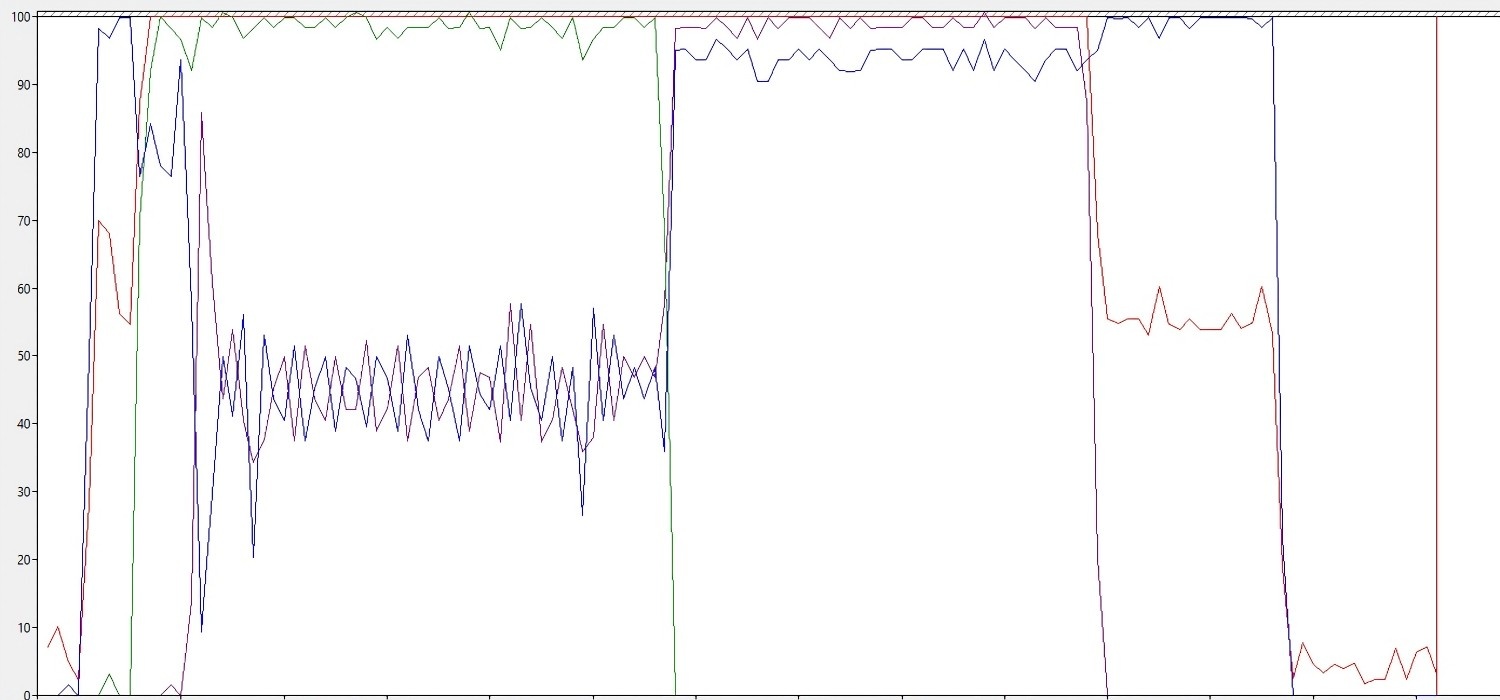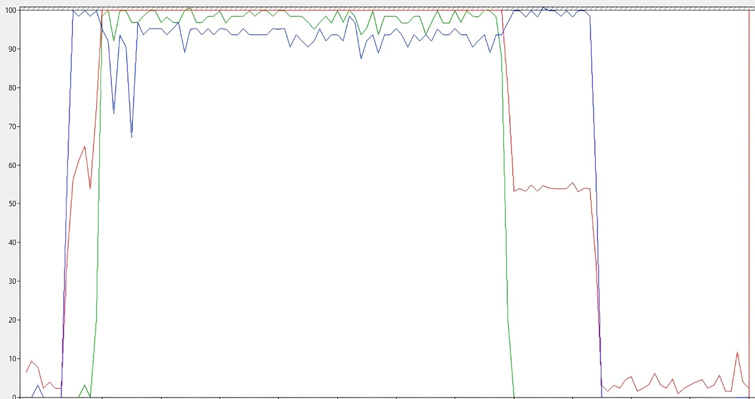 Instance-1 was initiated first (blue line) and consumed 100% of one logical processor, while one logical processor remained available. When Instance-2 was initiated (green line), it fully utilized the second logical processor, leaving no additional logical processors available. At this point, only CPU sharing is possible. When Instance-3 was initiated (purple line), it had to share CPU resources with Instance-1. This resource sharing significantly degraded performance.