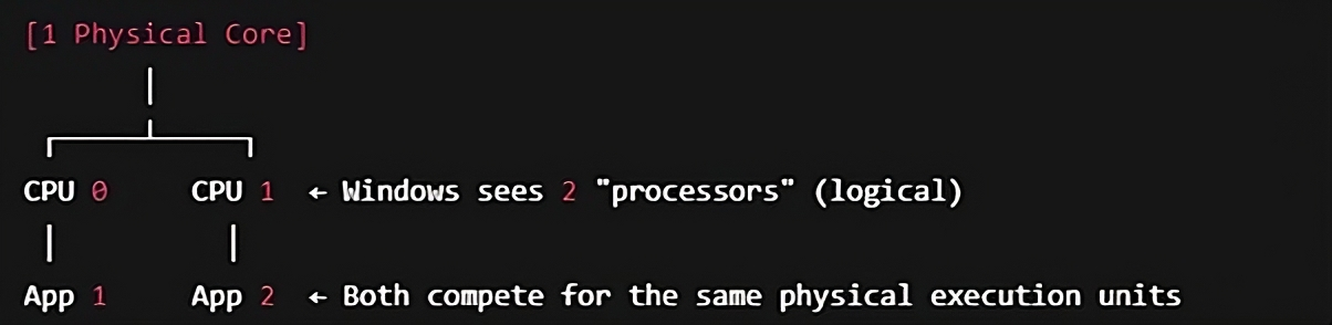 Even though Windows shows 2 CPUs in Task Manager, both are logical siblings on the same core. They share execution units, caches, and queues, so true parallelism is not possible. Windows scheduler tries to balance them, but: